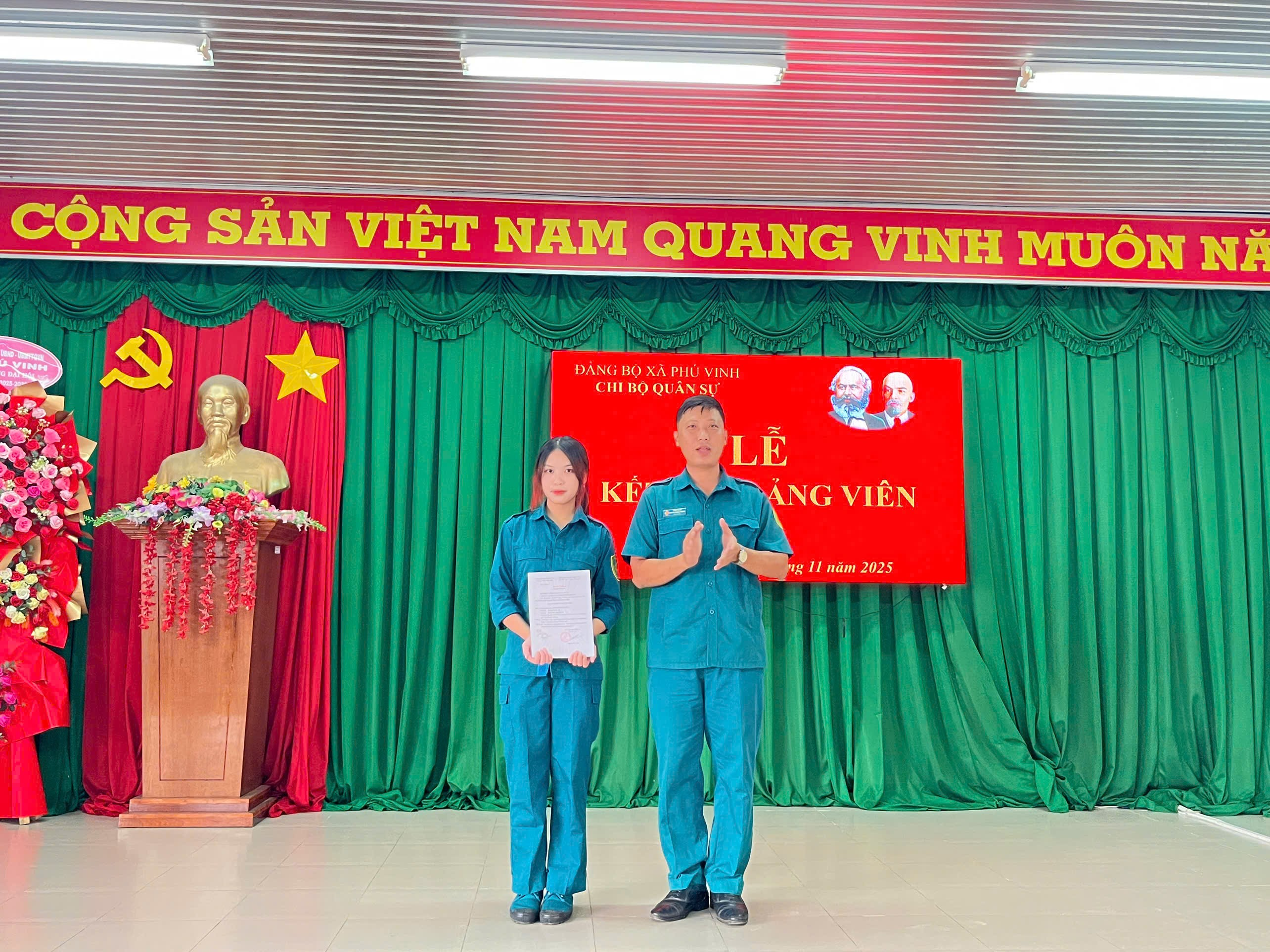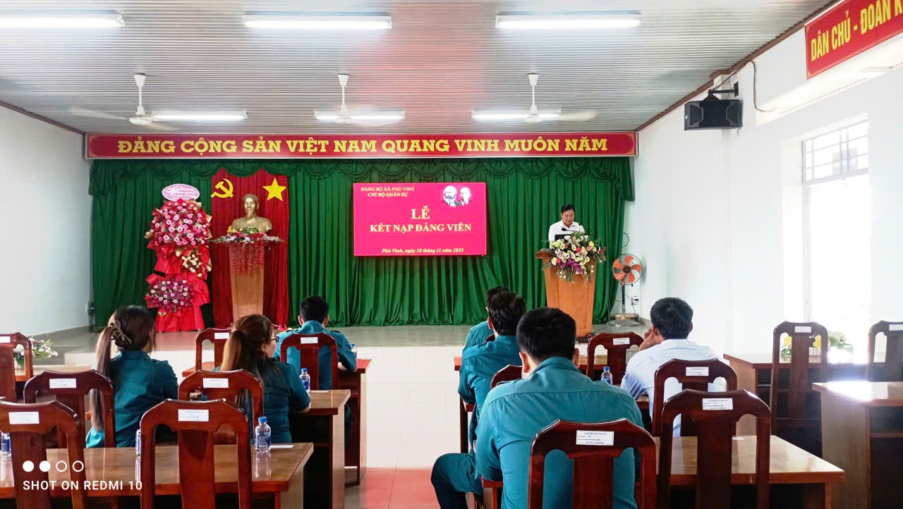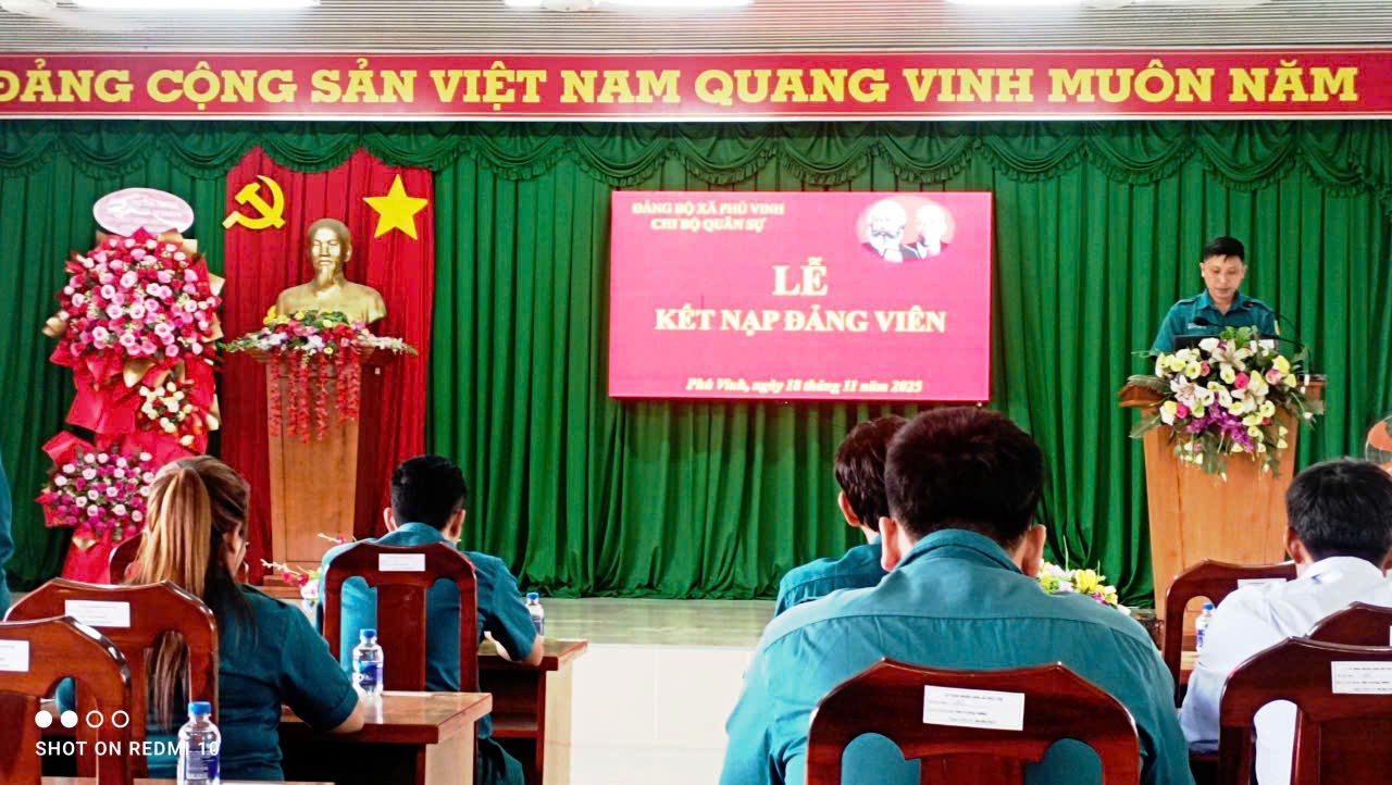 Công tác phát triển đảng viên luôn được Đảng ủy xã Phú Vinh quan tâm lãnh đạo, chỉ đạo nhằm không ngừng nâng cao năng lực lãnh đạo, sức chiến đấu của tổ chức cơ sở đảng và chất lượng đội ngũ đảng viên. Thực hiện Nghị quyết của Đảng ủy xã Phú Vinh về công tác phát triển đảng viên năm 2025, nhằm tiếp tục nâng cao năng lực lãnh đạo và sức chiến đấu của tổ chức cơ sở đảng, ngày 18/11/2025, tại Hội trường Đảng ủy xã, Chi bộ Quân sự đã long trọng tổ chức Lễ kết nạp đảng viên mới cho quần chúng ưu tú Lý Thị Phương Thùy, sinh ngày 14/04/2006.