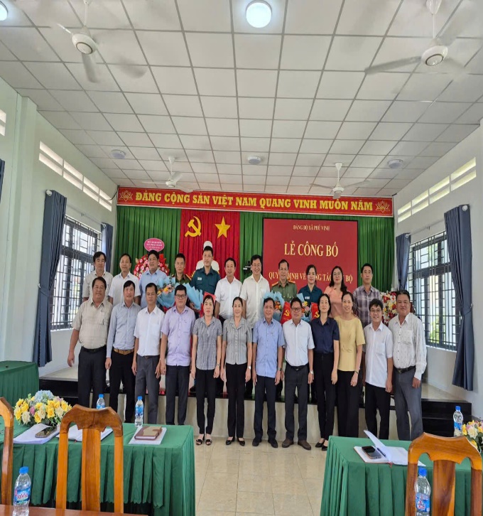 Hình ảnh Đ/c Đào Văn Tuấn- Bí thư Đảng ủy (bên phải); Đ/c Nguyễn Tiến Ngọc – Phó Bí thư Đảng ủy (bên trái), trao Quyết định và chụp hình lưu niệm với các đồng chí được chỉ định tham gia Ban Thường vụ, Ban Chấp hành Đảng bộ xã Phú Vinh, nhiệm kỳ 2025-2030.