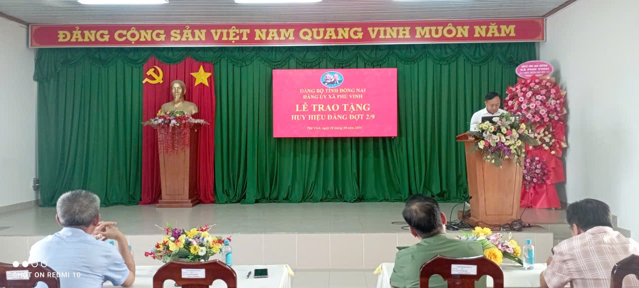 Trong không khí toàn Đảng, toàn Quân, toàn Dân đang phấn khởi thi đua lập thành tích chào mừng Đại hội đại biểu Đảng bộ các cấp tiến tới Đại hội Đại biểu toàn quốc lần thứ XIV của Đảng; Chào mừng kỷ niệm 80 năm Cách mạng tháng Tám thành công (19/8/1945 - 19/8/2025) và Quốc khánh Nước Cộng hòa Xã hội Chủ nghĩa Việt Nam (02/9/1945 - 02/9/2025). Sáng ngày ngày 29/8/2025, Đảng ủy xã Phú Vinh, tỉnh Đồng Nai đã long trọng tổ chức lễ trao tặng Huy hiệu 45 năm tuổi Đảng cho 01 đồng chí đảng viên thuộc Đảng bộ xã Phú Vinh.